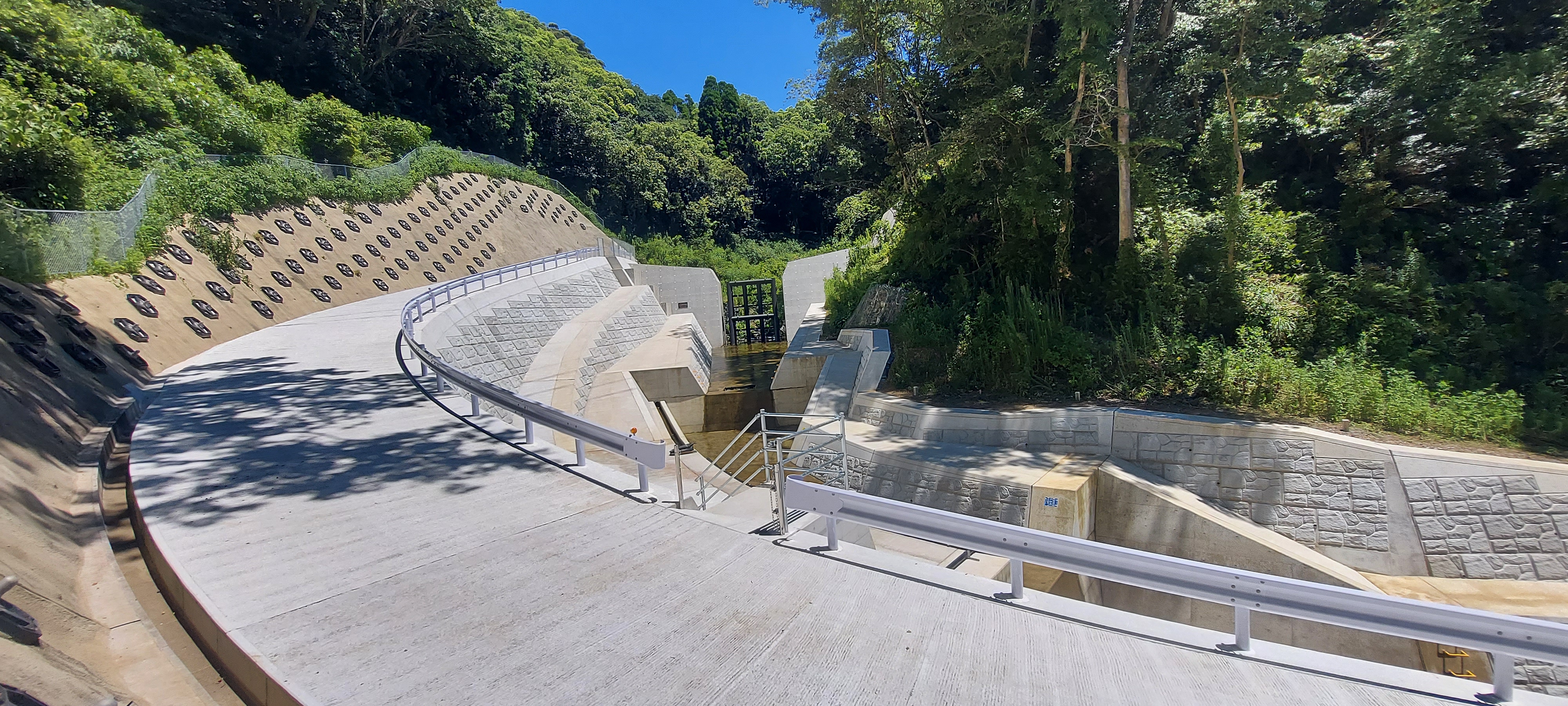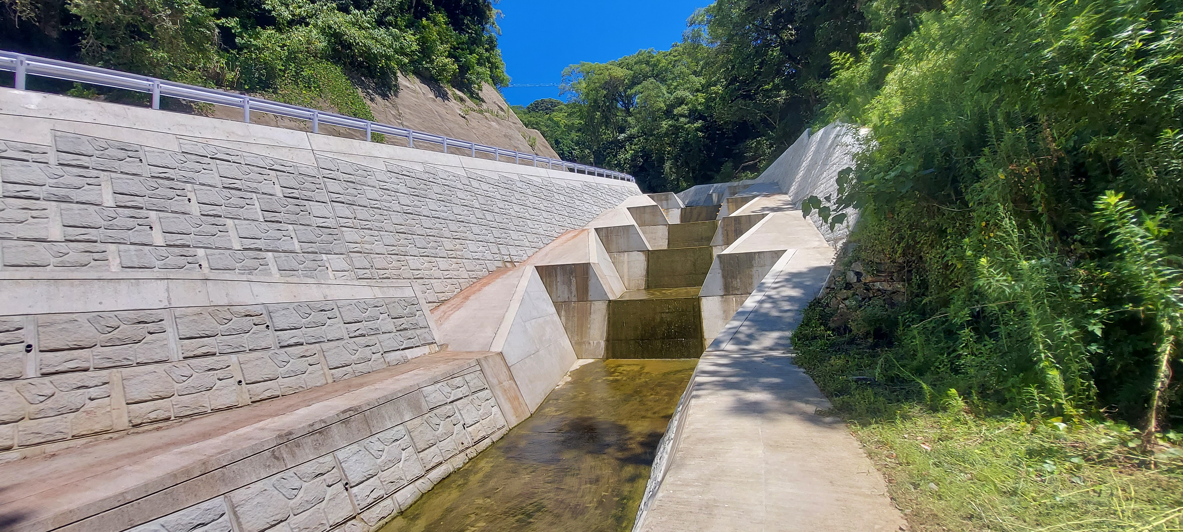 大川地区における事業間連携砂防工事。土砂災害を防ぐ砂防堰堤の整備を核とし、広範囲にわたる法面の吹付工やアンカー工による斜面安定化、および現場へのアクセスを確保する管理用道路の舗装までを一貫して施工。地域の防災機能向上に貢献しています。