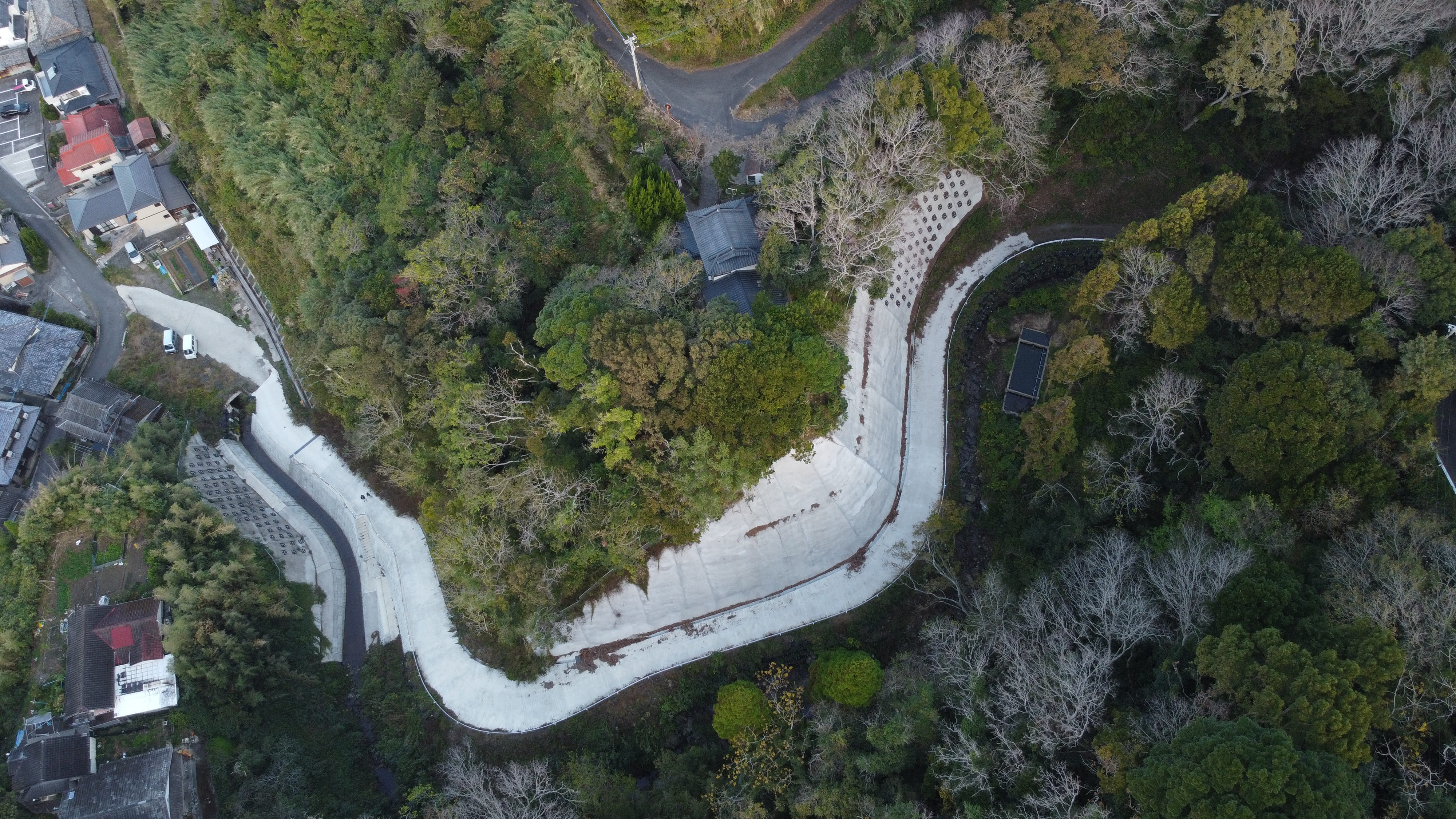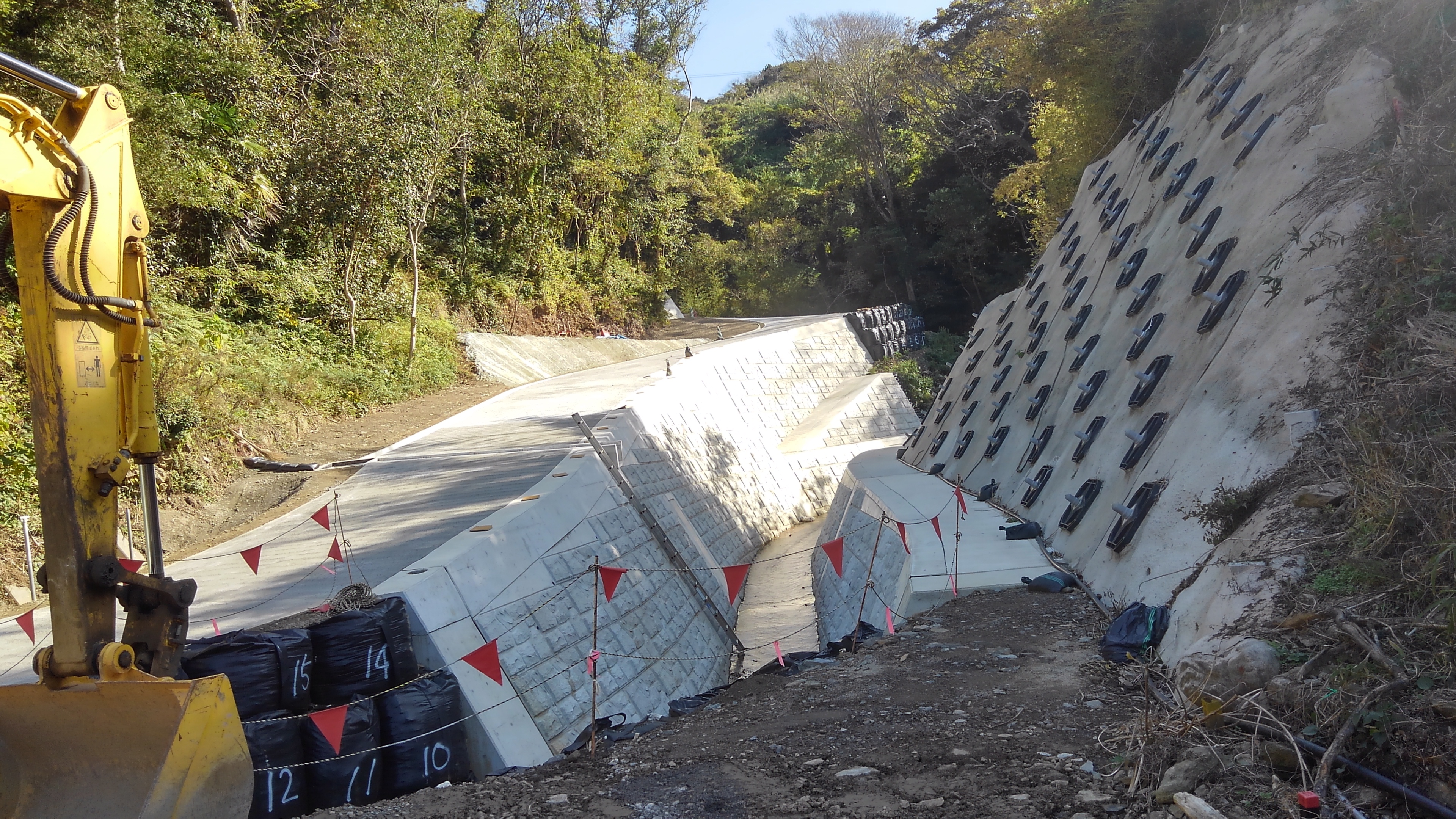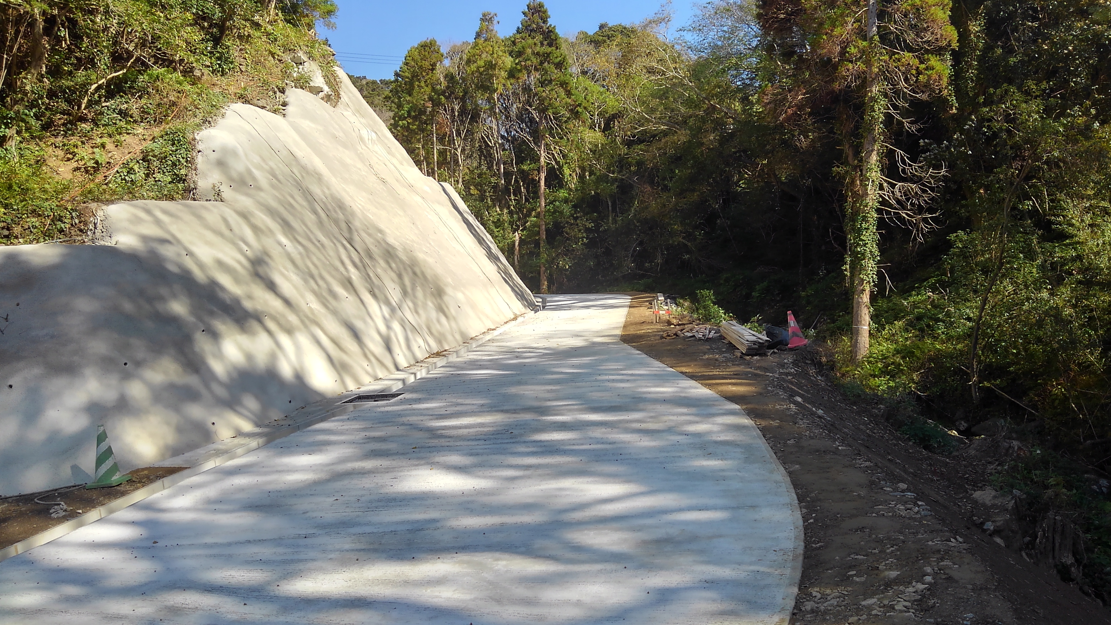 西彼杵半島における森林基幹道の災害復旧工事に従事いたしました。土砂崩れ等による被害箇所に対し、強固な法面(のりめん)保護やコンクリート打設を行い、通行の安全と山林の保全を確保。地域のインフラを守るため、地形に合わせた確実かつ丁寧な施工を徹底し、早期の復旧を実現しました。